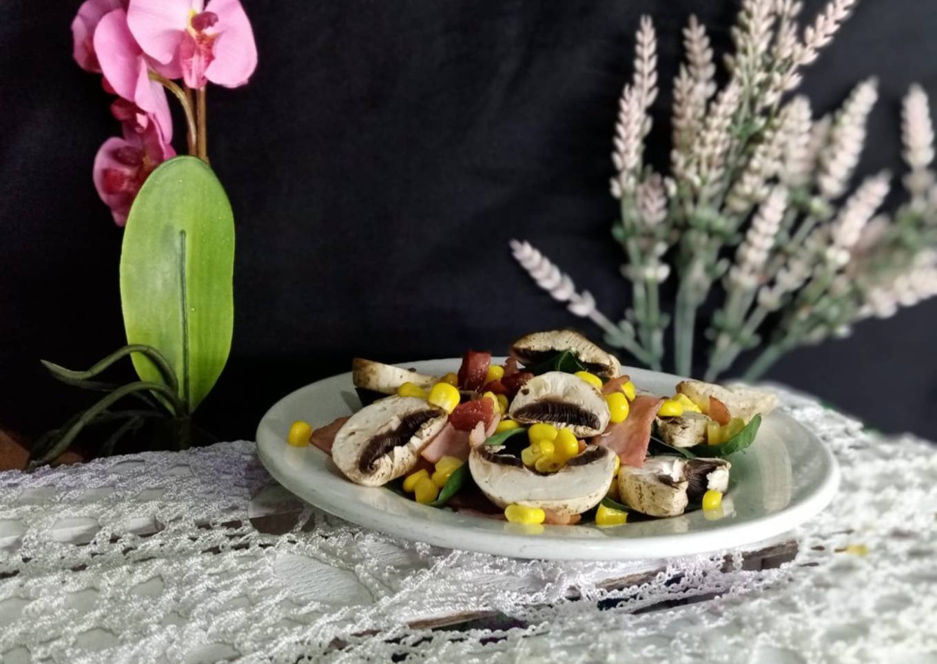 - Integramos nuestros elotes y champiñones, revolvemos y terminamos poniendo nuestro tocino y listo a degustar nuestra deliciosa ensalada fresca.