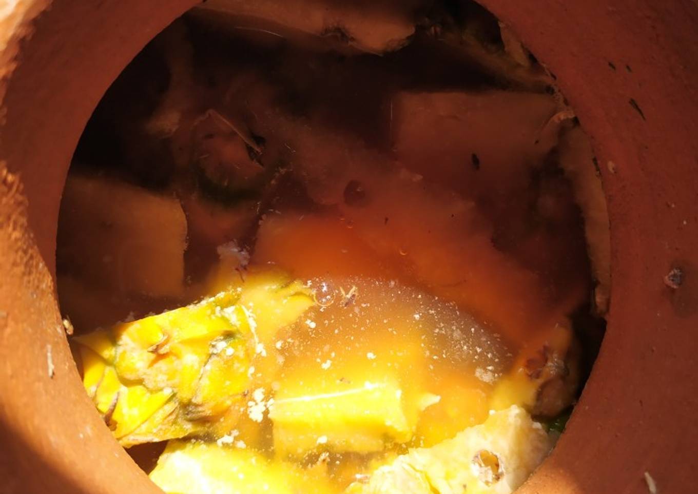 - En el recipiente de barro colocar las cáscaras de piña, agregar el líquido anterior (a temperatura ambiente) más medio litro más de agua, dejar fermentar máximo por dos días, no más de lo contrario se comienza a convertir en vinagre.