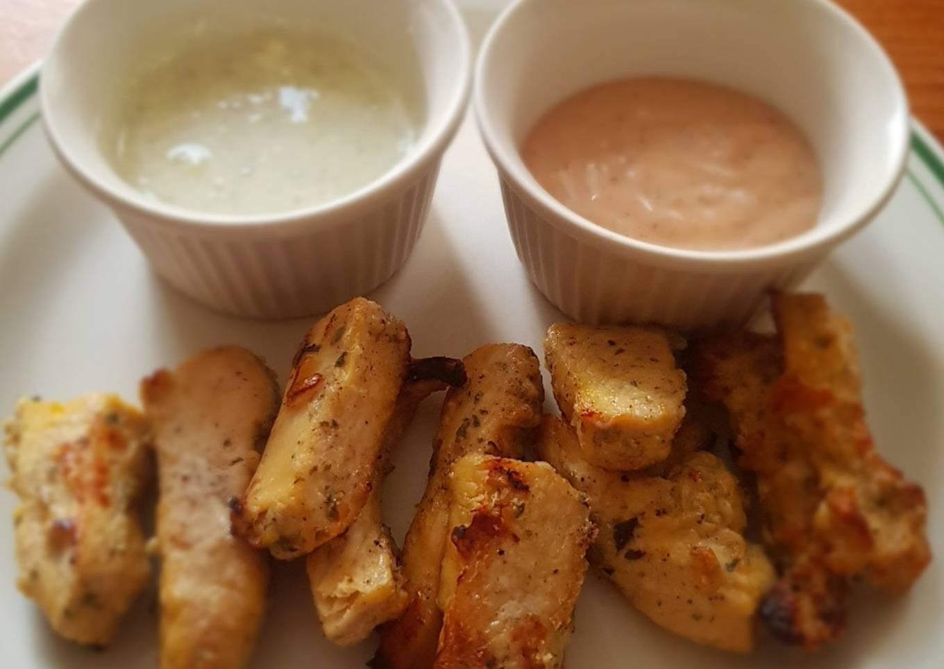 Para botanear sin culpas, unos ricos dedos de pollo que se hacen en el horno y se acompañan con dos dips bajos en calorías. #superbowl #cuidatusalud #saludable #DASH